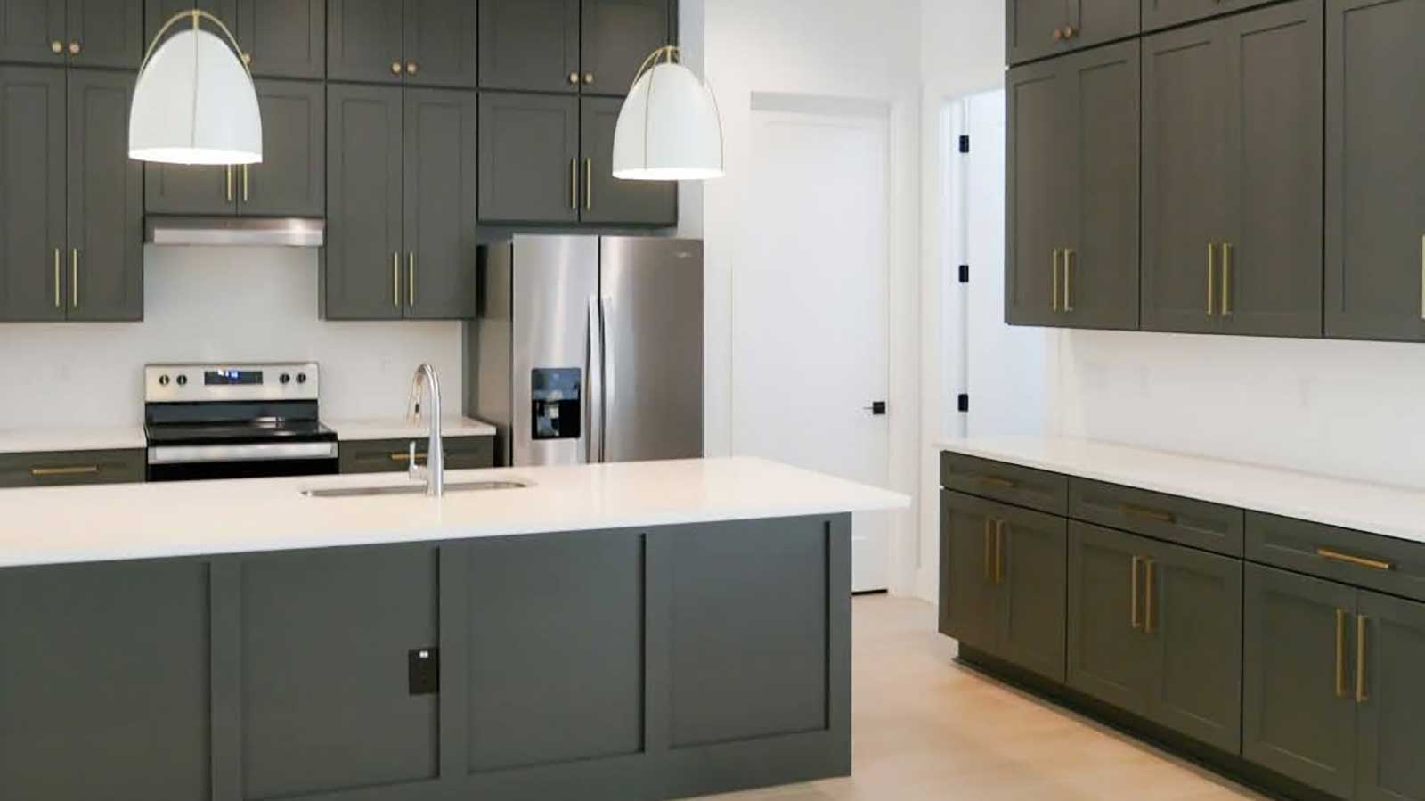 Modern kitchen with dark green cabinets, gold handles, white countertops, stainless steel appliances, and two large pendant lamps above a central island with a sink. Light wooden floor and white walls.